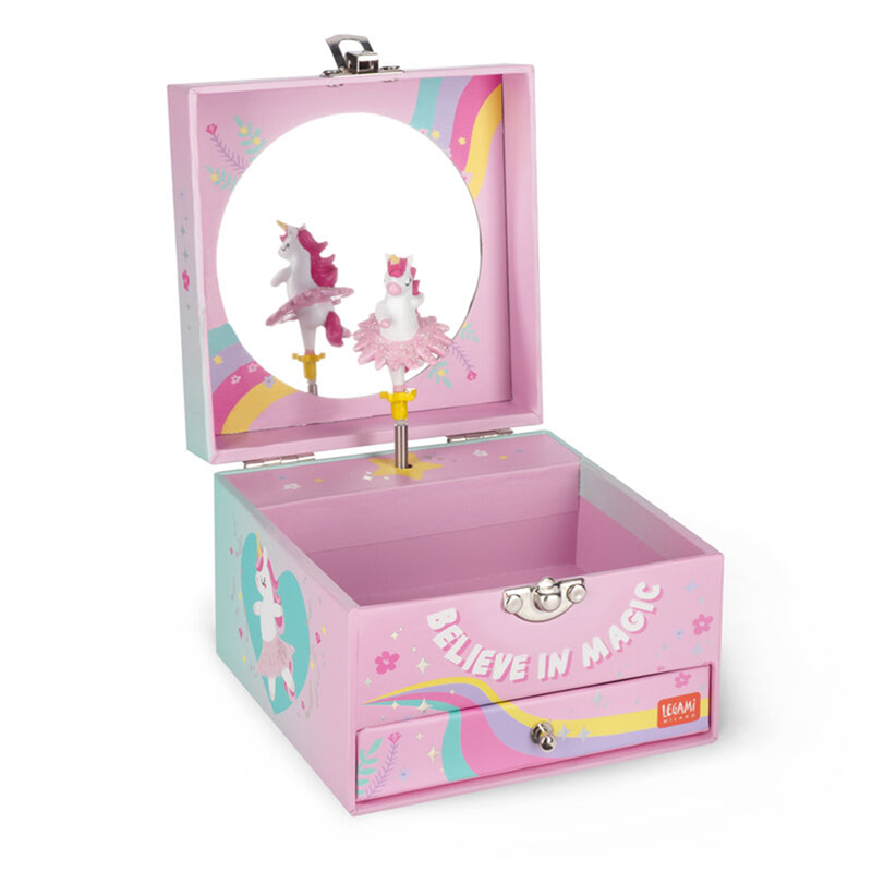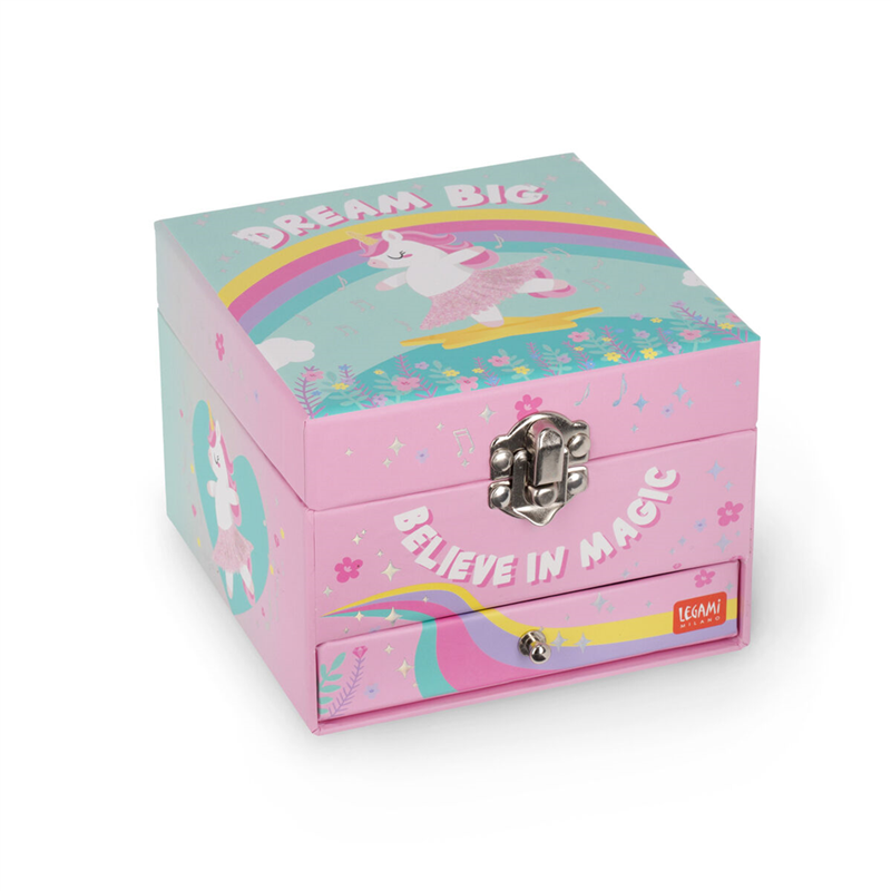 The "Music Box Unicorn Jewelry Box by Legami" is an elegant musical box that combines functionality and enchanting design. Carefully crafted, it features a magical unicorn inside that rotates to the sound of a sweet melody. Perfect for storing jewelry and small treasures, its interior is lined with soft velvet. The music box is equipped with an internal mirror and detailed decorations, making it an ideal gift for those who love fantasy and music.