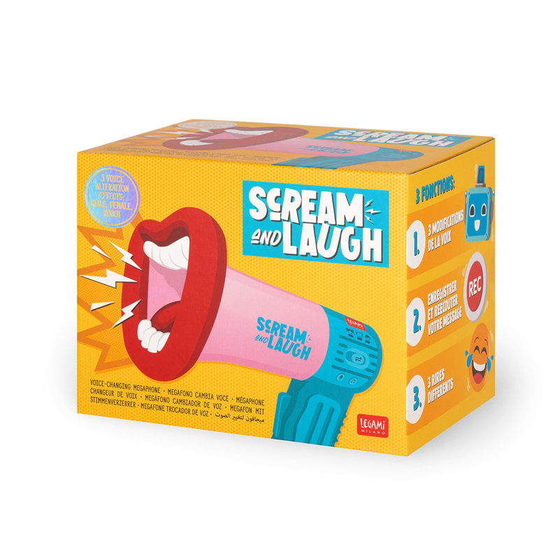 The English translation is: "The Scream And Laugh Voice Changing Megaphone by Legami is a fun device that allows you to modify your voice with hilarious sound effects. Perfect for parties and moments of joy, it offers various voice modulation options to create surprising laughs and screams. It operates on batteries and is easy to use, making it an ideal gadget to entertain friends and family."