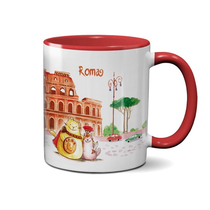 Ceramic Mug Red Interior 11oz 9.5cm Rome Rome-Colosseum And Gladiator Cats | Vertecchi Selection. | Selezione Vertecchi