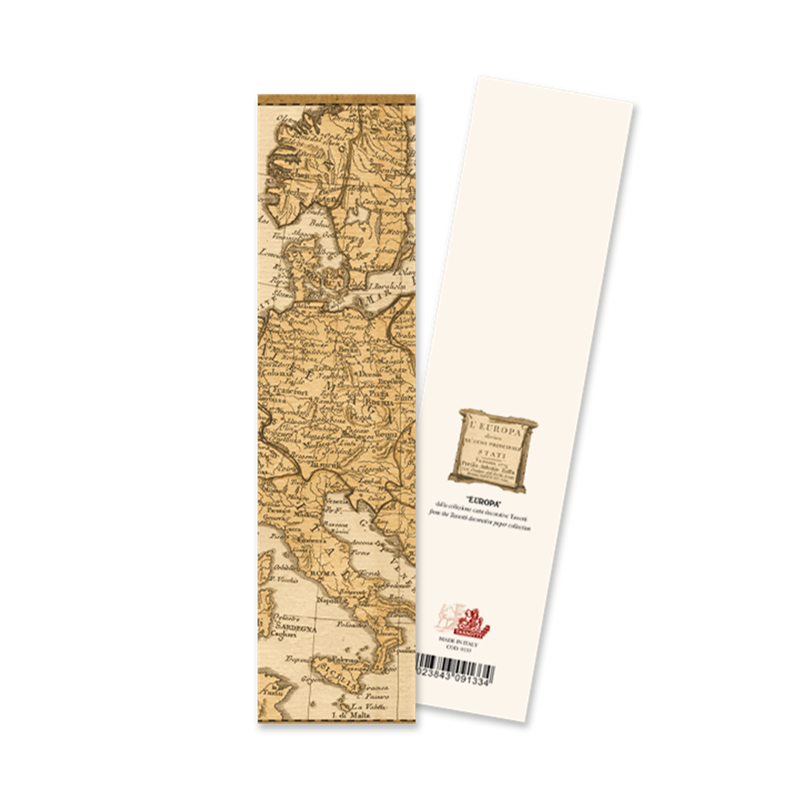 300 gsm ivory cardboard bookmark, dimensions 5x20 cm, decorated with details of a map. Made by Tassotti, ideal for those who love traveling and reading.