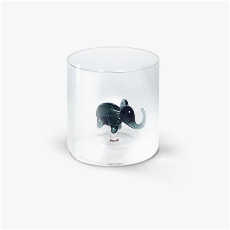 Add an original and creative touch to your table with this handcrafted borosilicate glass cup , featuring an internal elephant-shaped decoration . With a capacity of 250 ml , it is ideal for water, juices, tea or other drinks, combining elegance and practicality.