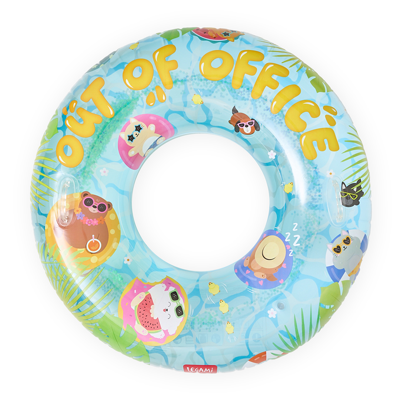 Maxi Donut - Maxi Pool Ring 102 cm diameter. The Out of Office by Legami is a donut-shaped inflatable pool float with a diameter of 102 cm. Ideal for relaxing and having fun in the water, it features an attractive design with the words "-Out of Office."- Made of high-quality materials to ensure strength and durability, it'-s perfect for those who want to enjoy their free time in style.