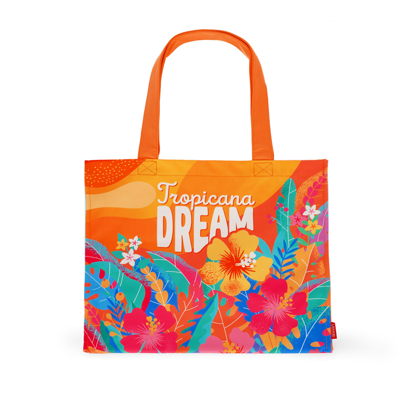 Durable fabric beach bag with a colorful tropical print, featuring large handles for comfortable carrying. Spacious and practical, it'-s perfect for carrying everything you need for a day at the beach. It features a zipper closure and an internal pocket for small items.