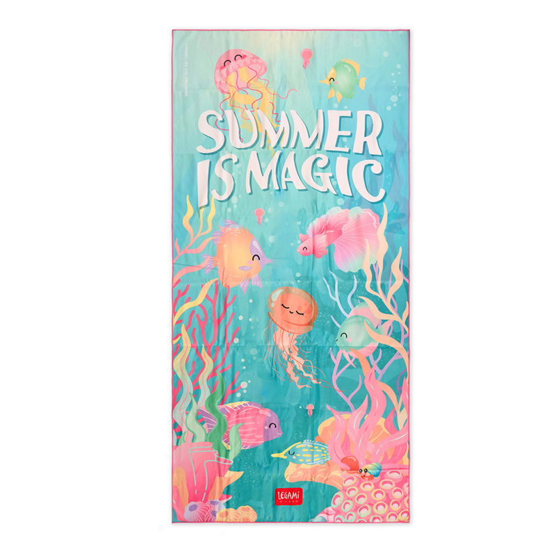 The Summer Is Magic beach towel by Legami is the perfect accessory for your summer days, made of soft, absorbent, high-quality fabric. Featuring a vibrant, colorful design, it evokes the carefree, joyful atmosphere of a beach holiday. Lightweight and easily portable, it'-s ideal for the beach, pool, or an outdoor picnic. Add a touch of magic to your summer adventures with this elegant and functional beach towel.