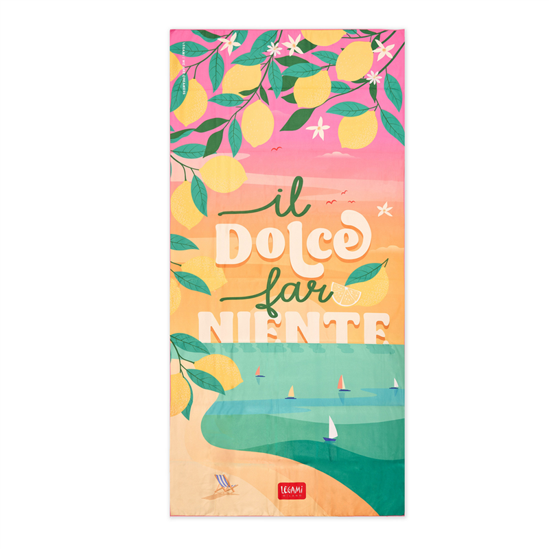 The Dolce Far Niente beach towel from Legami is made of microfiber and features a colorful, vibrant design, ideal for relaxing on the beach or by the pool. It'-s lightweight, absorbent, and quick-drying, perfect for comfort and convenience on summer days.