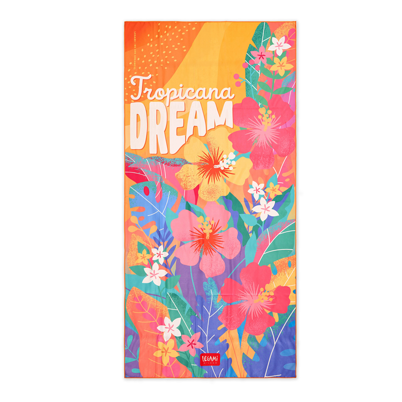 Microfiber beach towel with a colorful tropical design, absorbent and lightweight, ideal for the beach or pool. Compact and easy to carry, it dries quickly and offers comfort and style on sunny days.