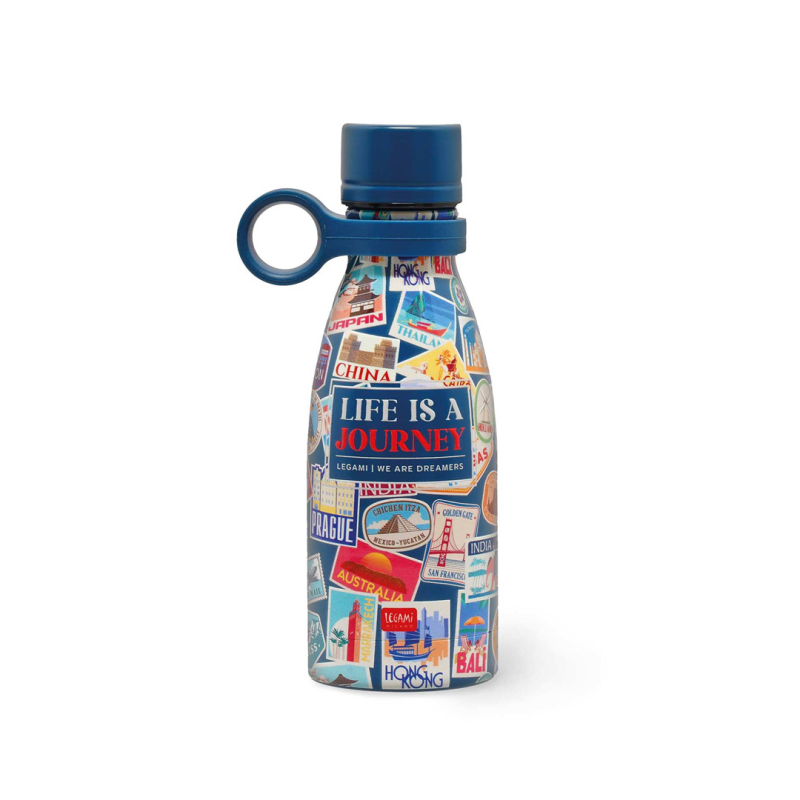 The Legami vacuum bottle - hot &- cold - mini travel stickers is a versatile accessory ideal for those always on the go. Made of stainless steel, it keeps drinks hot for up to 12 hours and cold for up to 24 hours. The compact design with cute travel stickers makes it perfect for those who love to travel in style. Capacity: 350 ml.