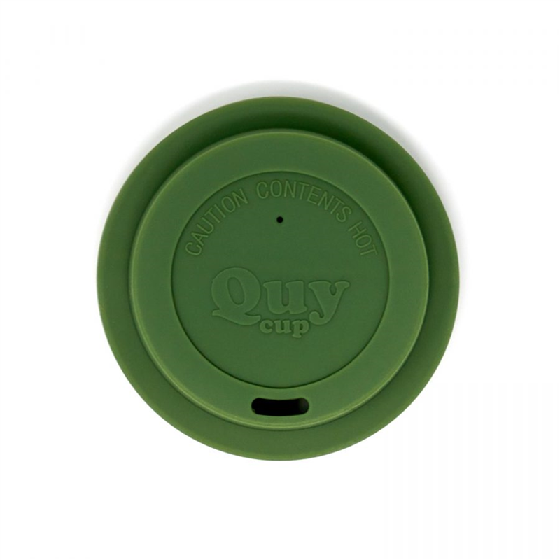 Green silicone lid for 90 ml coffee cup, compatible with Quy Cup, designed to retain heat and prevent spills.