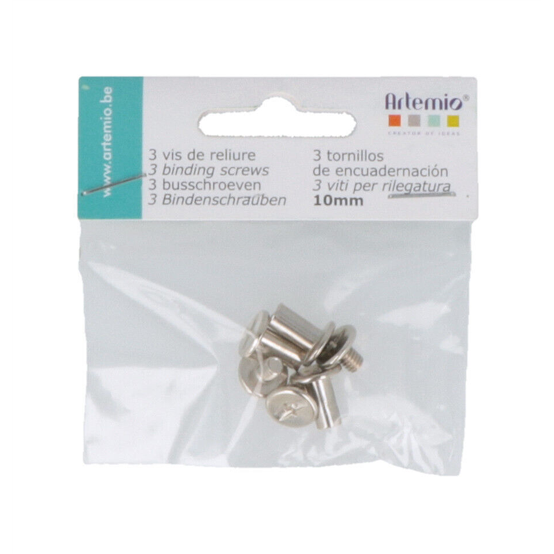 METAL BOOKBINDING SCREWS, 3 MM DIAMETER, 10 MM LENGTH. PACKED IN BLISTER. IDEAL FOR DOCUMENT BINDING, ALBUMS, AND DIY PROJECTS. MADE BY SA ARTEMIO.