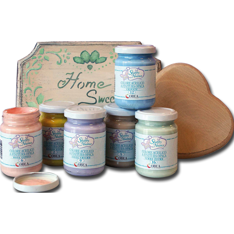 line of chalk effect colours, created specifically to recreate the shabby style on multiple supports, such as wood, glass, ceramic, tin, etc. composed of pastel shades that are cohesive and mixable with each other. To create the decapé effect, apply a coat of the chosen colour, as soon as it is dry, rub shabby wax stick in the areas where you want to obtain a worn effect, finally apply a lighter color than the first. after drying it will be possible to pass the sandpaper, doing so the shades preserved by the wax will appear. the final effect is opaque, the product is ready for use. Any dilution can occur with water.
