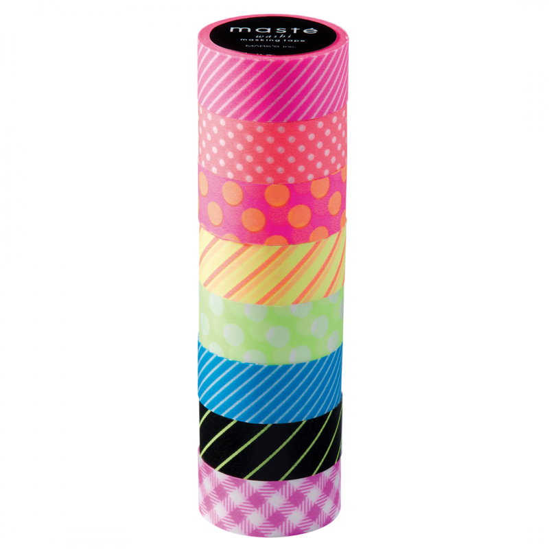 Mark's Masking Tape 15mmx7mt 8pcs Mast� Pattern Mix Visible Neon is a set of decorative adhesive tapes featuring bright neon colors and mixed pattern designs. Each tape is 15 mm wide and 7 meters long. The set includes 8 rolls, perfect for personalizing and decorating creative projects, scrapbooking, gift wrapping, and other craft applications. These tapes are easily removable and repositionable without leaving residue, thanks to their washi paper composition, making them suitable for temporary use on various surfaces.