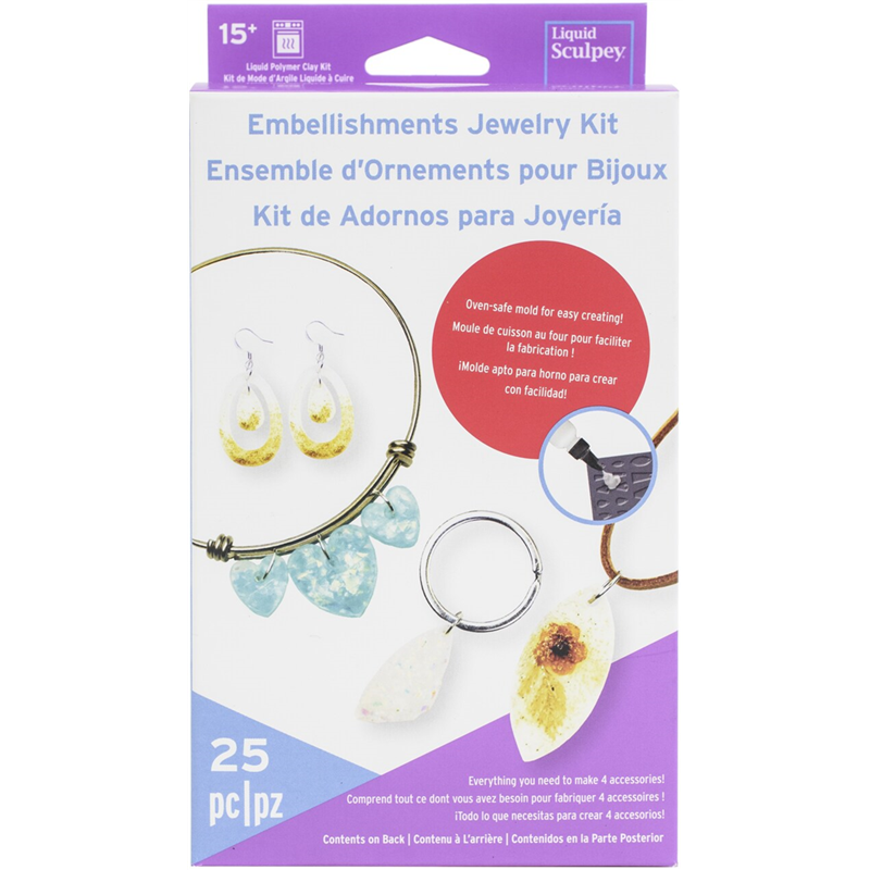 the kit contains everything you need to create incredible jewels: a 30ml bottle of liquid sculpey clear, a baking mould, opalescent flakes, turquoise flakes, golden rhinestones, dried flowers, toothpicks and accessories for 4 jewels.
