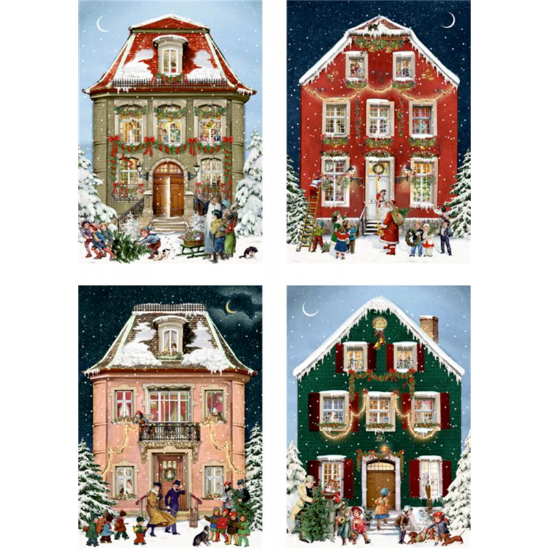 Victorian Houses Advent Card by Die Spiegelburg: A charming Christmas card featuring detailed illustrations of Victorian houses, perfect for creating a festive atmosphere. Each numbered window opens to reveal a surprise, bringing the countdown to Christmas with elegance and tradition. A charming addition to your holiday celebrations, ideal for decorating and gifting.