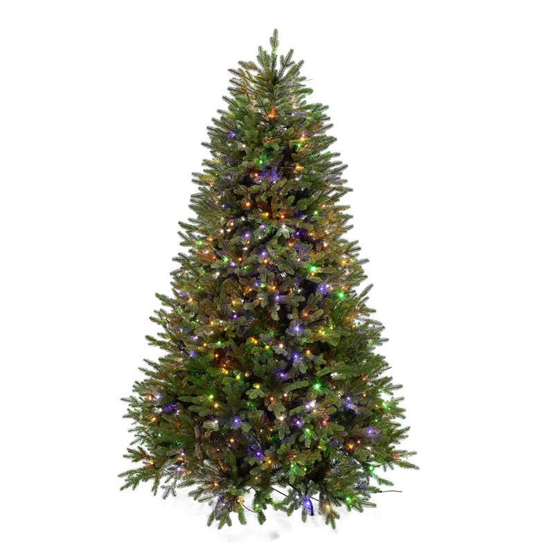 LARGE TREE WITH POLYETHYLENE BRANCHES ON THE VISIBLE PART AND PVC FILLING BRANCHES INSIDE. WITH RGB LED LIGHTS AND REMOTE CONTROL FOR CHANGING COLORS AND LIGHT EFFECTS. TURN THE TREE ON AND OFF- SET THE TIMER TO 6 HOURS OR 8 HOURS OF ON TIME- INCREASE OR DECREASE THE BRIGHTNESS OF THE LEDS- KEY NUMBER 1 = AUTOMATIC VARIATION OF THE 4 TYPES OF LED LIGHT (WARM WHITE LIGHT, STRONG MULTICOLOUR LIGHT, MEDIUM MULTICOLOUR LIGHT, PASTEL MULTICOLOUR LIGHT)- KEY NUMBER 2 = WARM WHITE LIGHT- KEY NUMBER 3 = STRONG MULTICOLOUR LIGHT- KEY NUMBER 4 = MEDIUM MULTICOLOUR LIGHT- KEY NUMBER 5 = PASTEL MULTICOLOUR LIGHT- KEY FROM NUMBER = 6 TO NUMBER 11 VARIOUS LIGHT EFFECTS