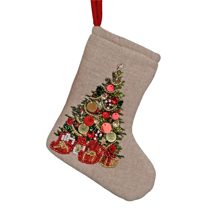 THIS FABRIC STOCKING FEATURES A TREE-THEMED DESIGN AND MEASURES 16.5 CM. PERFECT FOR ADDING A FESTIVE TOUCH TO YOUR HOME DURING THE HOLIDAYS.