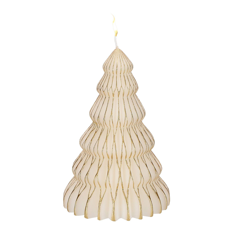 Decorative paper tree-shaped candle with an elegant white and gold finish. 19 cm tall. Perfect for adding a festive and sophisticated touch to your space.