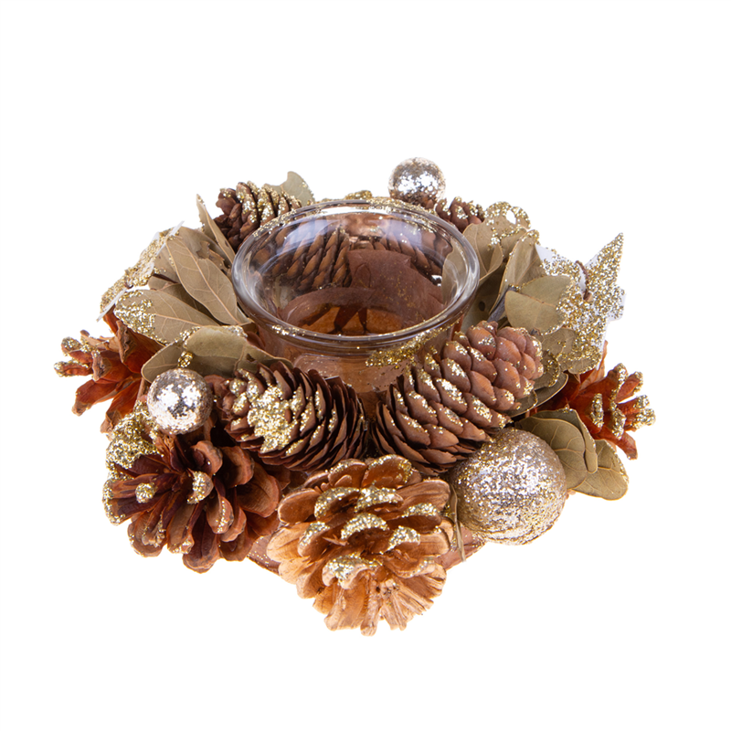 ELEGANT DECORATIVE CANDLE HOLDER WITH A REFINED DESIGN COMBINING PINE CONES, STARS, AND BALLS, ALL IN A BEAUTIFUL NATURAL GOLD SHADE. Measuring 15 cm in diameter, this candle holder adds a touch of warmth and style to any setting, perfect for creating a welcoming and festive atmosphere.