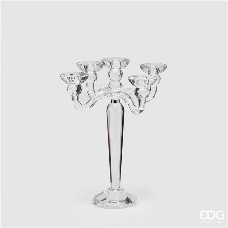 the crystal x5 candle holder by edg - enzo de gasperi is an elegant furnishing accessory 39 cm high with a diameter of 30 cm. made of crystal, it features a sophisticated and modern design with five arms, ideal for adding a touch of luxury and refinement to any environment.