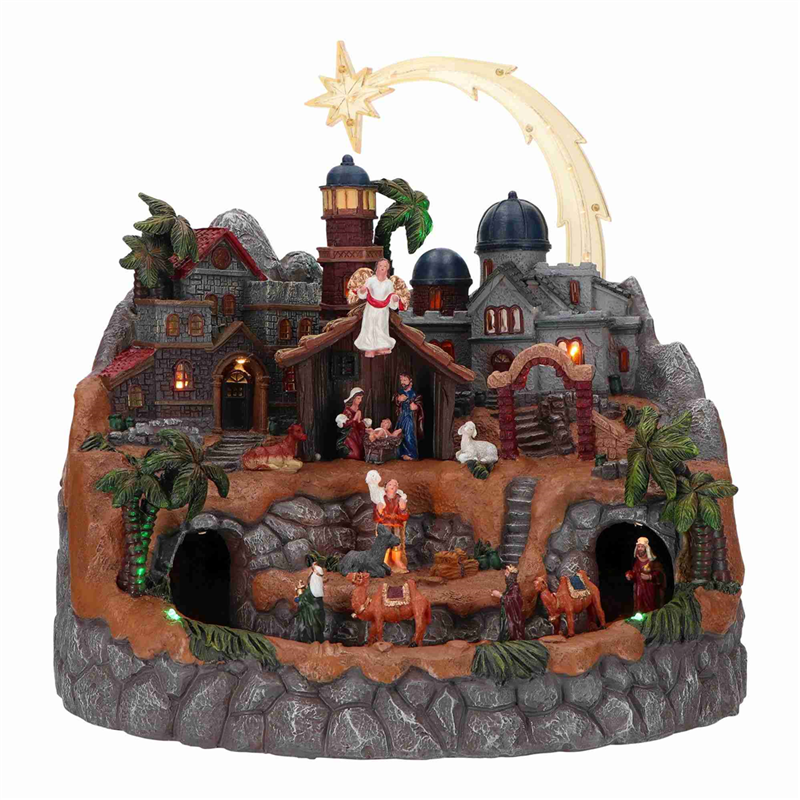 The Comet Star Village Nativity Music Box is an enchanting Christmas representation that combines art and music. This decorative piece features a detailed nativity scene set in a picturesque village with a shining comet illuminating the sky. Crafted from high-quality materials, the music box offers a traditional Christmas tune that adds a magical touch to the holiday atmosphere. Perfect for enriching your home'-s Christmas decor, it is a piece that captivates both adults and children, representing the spirit of Christmas with elegance and sophistication.