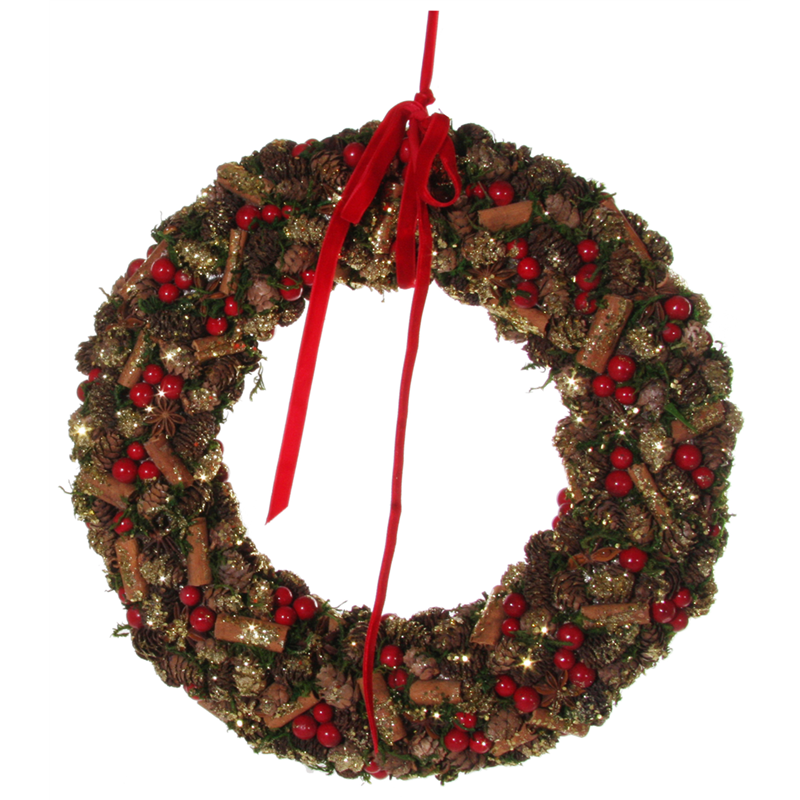 DECORATIVE WREATH, 35 CM IN DIAMETER, MADE WITH SPICES AND GLITTERED RED BERRIES. PERFECT FOR ADDING A FESTIVE, NATURAL TOUCH TO YOUR SPACE, IDEAL FOR DECORATING DOORS, WALLS, OR TABLES DURING THE HOLIDAYS.