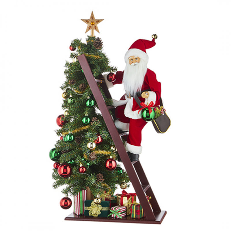 Raz Imports Christmas decoration, 88 cm tall, featuring Santa Claus climbing a ladder with a Christmas tree. It is adorned with baubles and gifts, ideal for adding a festive touch to your home.