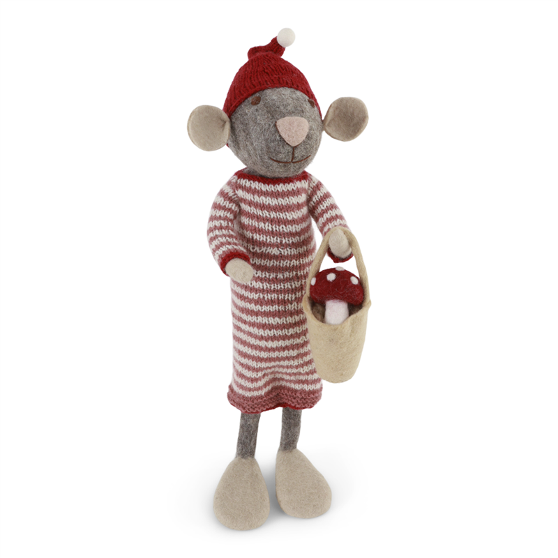 MOUSE IN A STRIPED DRESS WITH A BASKET OF RED AND WHITE MUSHROOMS: A DELIGHTFUL HANDMADE DECORATION, PERFECT FOR ADDING A TOUCH OF FAIRYTALE CHARM. FIGURINE FEATURES A DETAILED MOUSE IN A COLORFUL STRIPED DRESS AND A CUTE BASKET CONTAINING A BRIGHTLY COLORED MUSHROOM. IDEAL FOR HOME DECORATION OR AS A UNIQUE AND CHARMING GIFT.