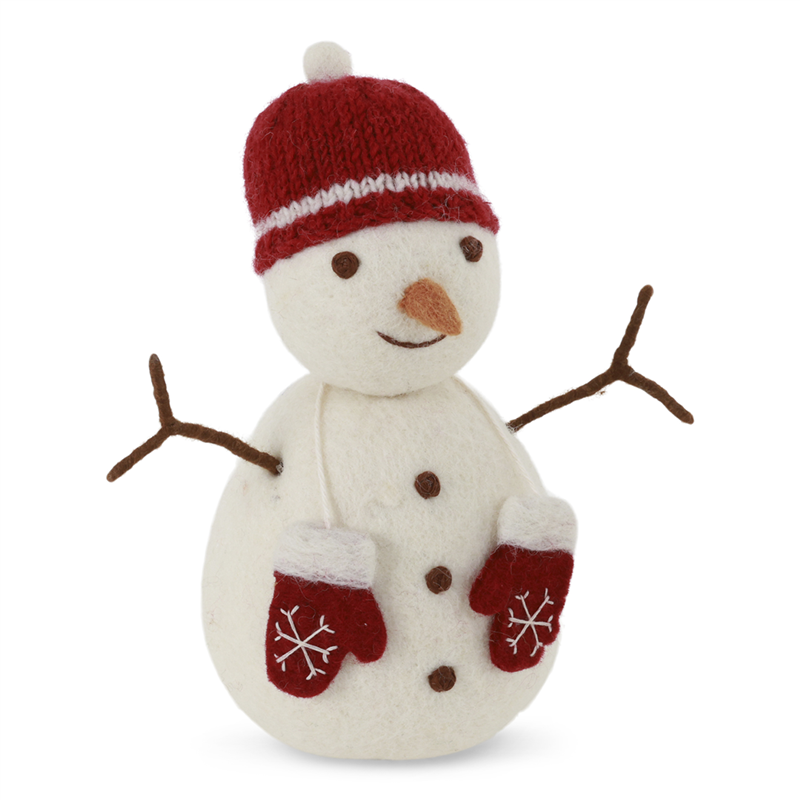 A HANDMADE FELT SNOWMAN WITH AN EYE-CATCHING, DETAILED DESIGN. He wears a pair of RED GLOVES that add a pop of bright, festive color. PERFECT FOR CHRISTMAS DECORATION, THIS FELT SNOWMAN IS IDEAL FOR ADDING A TOUCH OF CRAFTSMANSHIP AND WARMTH TO YOUR HOME DURING THE HOLIDAYS.