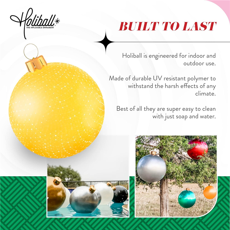 HOLIBALL INFLATABLE ORNAMENT® IS BIGGER THAN LIFE! INFLATABLE, DEFLATABLE, REUSABLE AND EASY TO STORE.