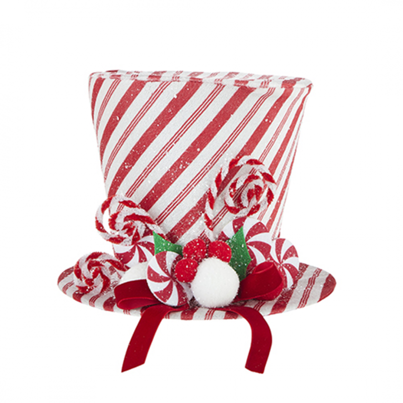 Peppermint Top Hat with Bow, size 23 cm, made by Raz Imports. This elegant hat features a festive design with vibrant colors reminiscent of Christmas, enhanced by a decorative bow that accentuates its appearance. Perfect for Christmas decorations or as a distinctive element for special occasions.