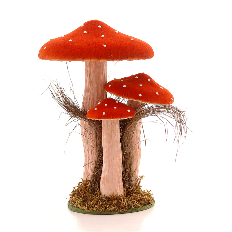 Set of three decorative mushrooms with grass, 36.5 cm tall, in red and white. Perfect for adding a vibrant, natural touch to any space.