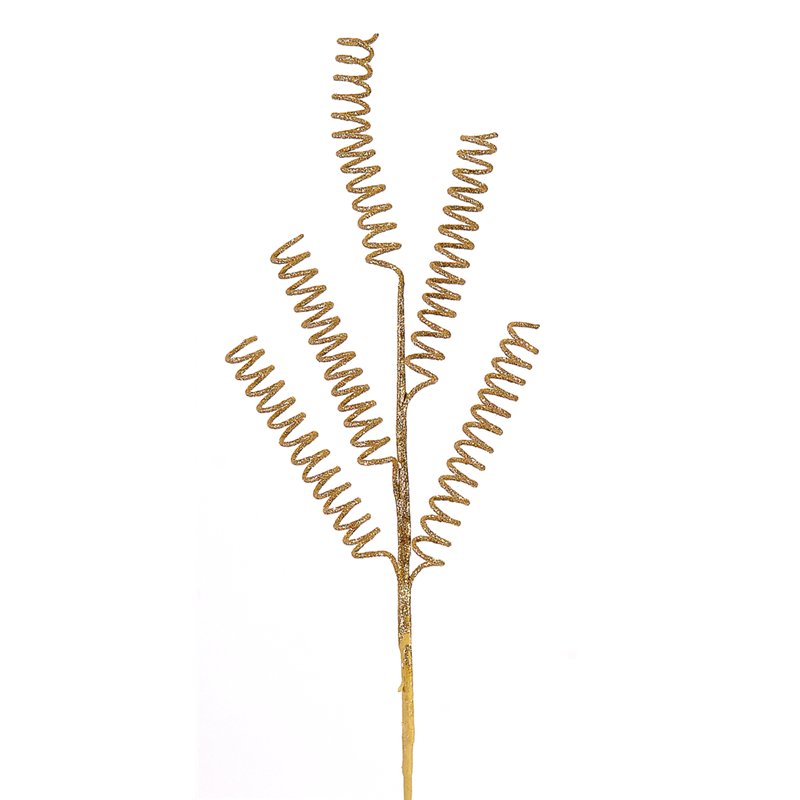 THE 74 CM GOLD GLITTER CURL BRANCH X5 FROM THE VERTECCHI SELECTION IS AN ELEGANT DECORATIVE ELEMENT CHARACTERIZED BY SPARKLING CURLS WITH A GLITTER FINISH, PERFECT FOR ENRICHED FLORAL ARRANGEMENTS, CHRISTMAS DECORATIONS OR FESTIVE ARRANGEMENTS WITH A TOUCH OF LUXURY AND GOLDEN SHINE.