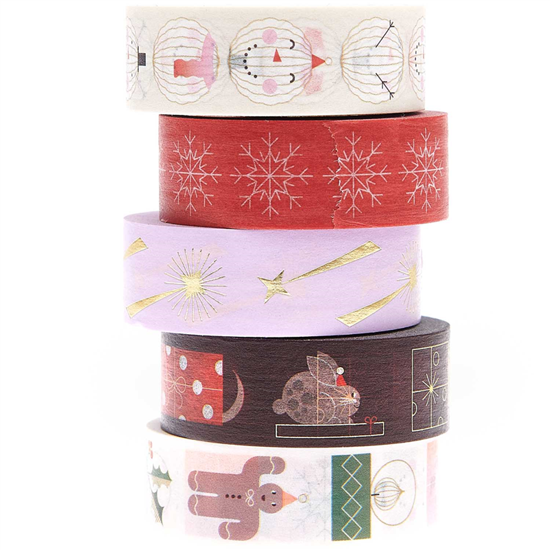 Set of 5 "I Love Christmas" decorative adhesive tapes by Rico Design, each measuring 1.5 cm in width and 10 meters in length. Perfect for Christmas decorations, scrapbooking, gift wrapping, and creative projects, they feature festive patterns and vibrant colors that add a touch of cheer to your Christmas creations.