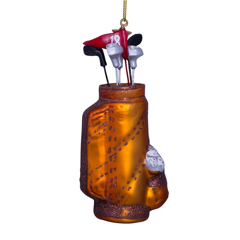 A 15 cm tall brown glass golf bag ornament. This elegant ornament is ideal for golf enthusiasts and adds a sophisticated, sporty touch to your Christmas tree or any holiday decor. Crafted with meticulous attention to detail, its glossy finish and realistic detailing make it a distinctive and eye-catching piece.