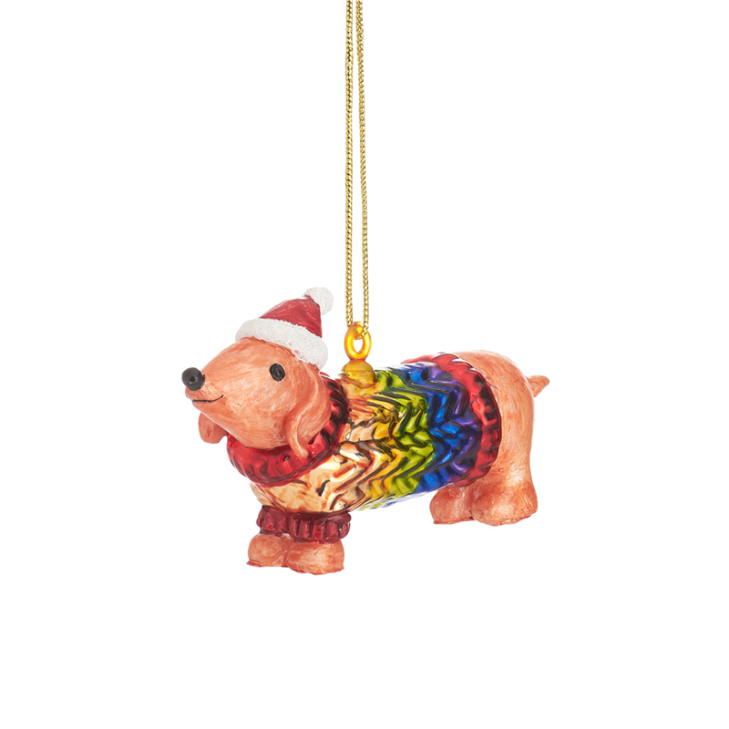 This glass ornament features an adorable dachshund wearing a rainbow sweater, adding a touch of color and cheer to your décor. Crafted with meticulous attention to detail, this ornament is perfect for animal lovers looking for a vibrant and unique addition to their home or Christmas tree.