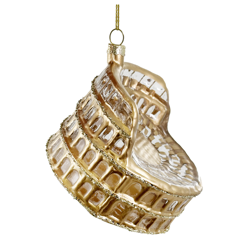 CLEAR GLASS ORNAMENT WITH GOLD DETAILS, DEPICTING THE COLOSSEUM, WITH A DIAMETER OF 9 CM. IDEAL FOR ADDING AN ELEGANT AND HISTORICAL TOUCH TO YOUR INTERIOR DECORATION.
