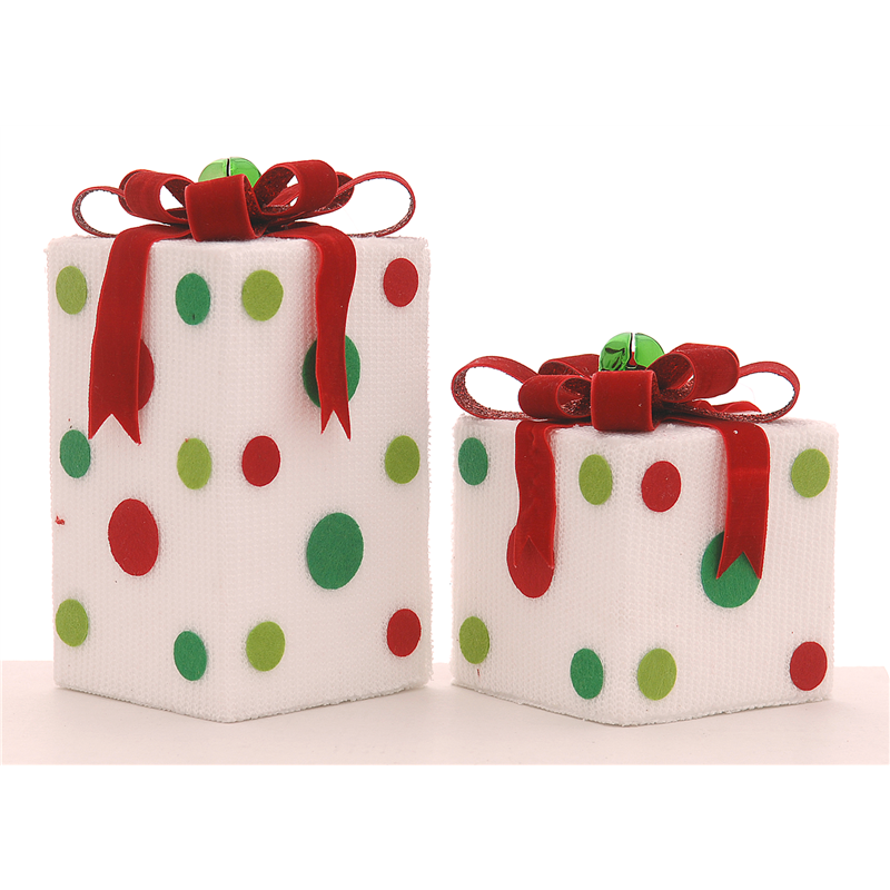 Decorative gift box ornament with dots and ribbons design, 24 cm tall, in white, red, and green. Perfect for adding a festive and elegant touch to your gifts.