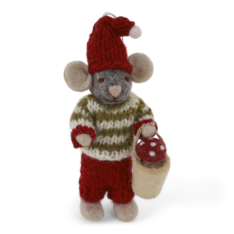 Felt ornament depicting Mickey Mouse with a mushroom-shaped basket in green and red. Handcrafted with meticulous attention to detail, this ornament adds a touch of magic and cheer to any space, perfect for decorating a Christmas tree or enhancing your home during the holidays.