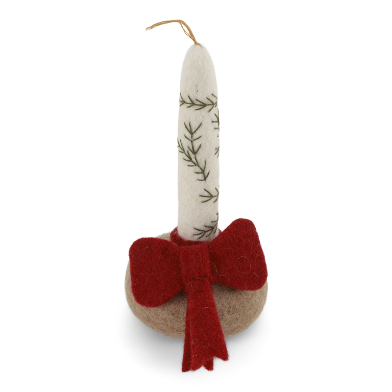 CHRISTMAS ORNAMENT MADE OF FELT IN THE SHAPE OF A CANDLE, EMBELLISHED WITH AN ELEGANT RED BOW. PERFECT FOR ADDING A FESTIVE AND COZY TOUCH TO YOUR CHRISTMAS DECORATION.