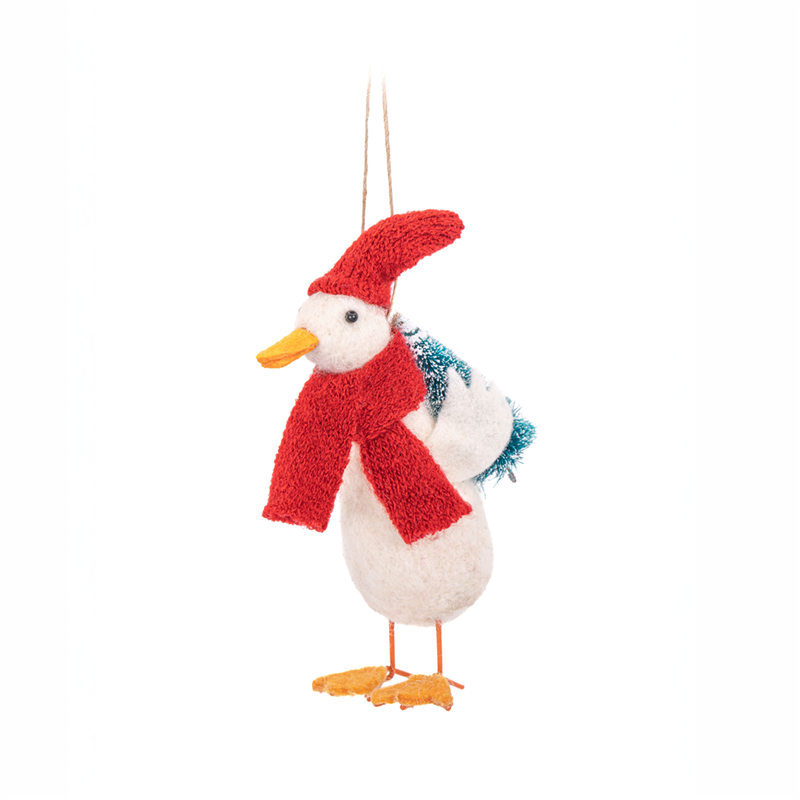 This felt ornament features a decorative goose adorned with a small tree and hat in white, red, and green. Perfect for adding a festive touch to your Christmas decor, this ornament combines a playful design with traditional details, perfect for enhancing the holiday atmosphere.