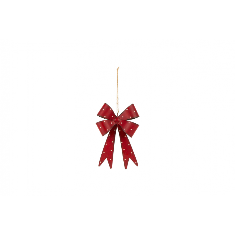 Metal ornament in the shape of a bow, measuring 25x15.5x4 cm, featuring a red and white polka dot design, part of the Vertecchi Selection.