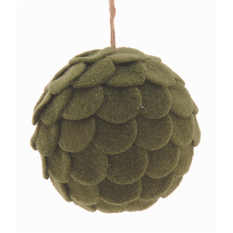GREEN FELT PINE CONE DECORATIVE BALL, 13 CM IN DIAMETER. PERFECT FOR ADDING A NATURAL AND FESTIVE TOUCH TO ANY SPACE.
