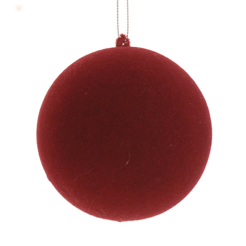 THE 15CM FLOCKED BURGUNDY SPHERE IS AN ELEGANT DECORATIVE ELEMENT WITH A DIAMETER OF 15CM. THE SURFACE IS COVERED IN A DEEP BURGUNDY VELVETY MATERIAL, WHICH GIVES IT A LUXURIOUS AND SOPHISTICATED LOOK. PERFECT FOR CHRISTMAS DECORATIONS OR TO ADD A TOUCH OF ELEGANCE TO ANY SPACE, THE SPHERE IS DISTINGUISHED BY ITS SOFT FINISH AND ITS RICH, DEEP COLOR.