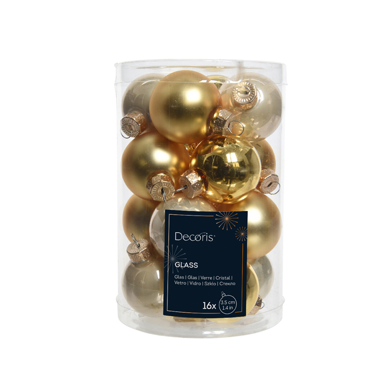 set of 16 glass spheres with a diameter of 3.5 cm, characterised by a mix of shiny and matte finishes in pearl and gold tones, ideal for elegant and sophisticated decorations.