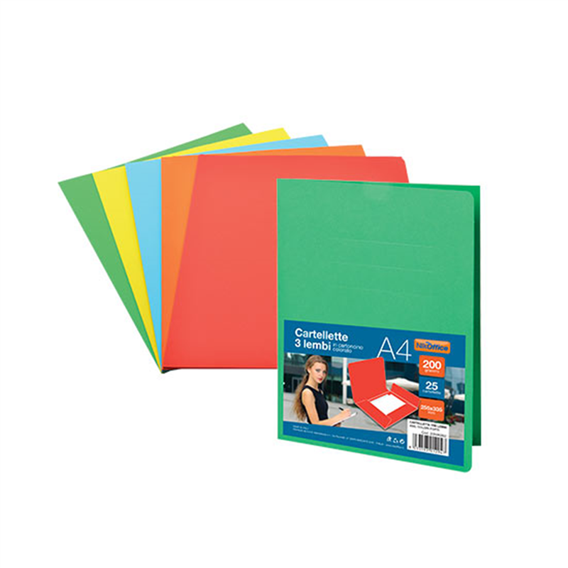 3-flap folder in strong colored cardboard. 200 gr cardboard.