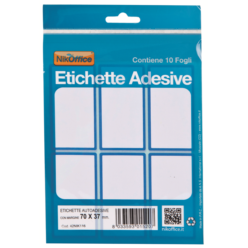 Nikoffice adhesive labels in a pack of 10 sheets, size 70x56 mm. Each sheet contains 4 labels, ideal for organization and identification. Easy to apply and remove, suitable for home or office use.