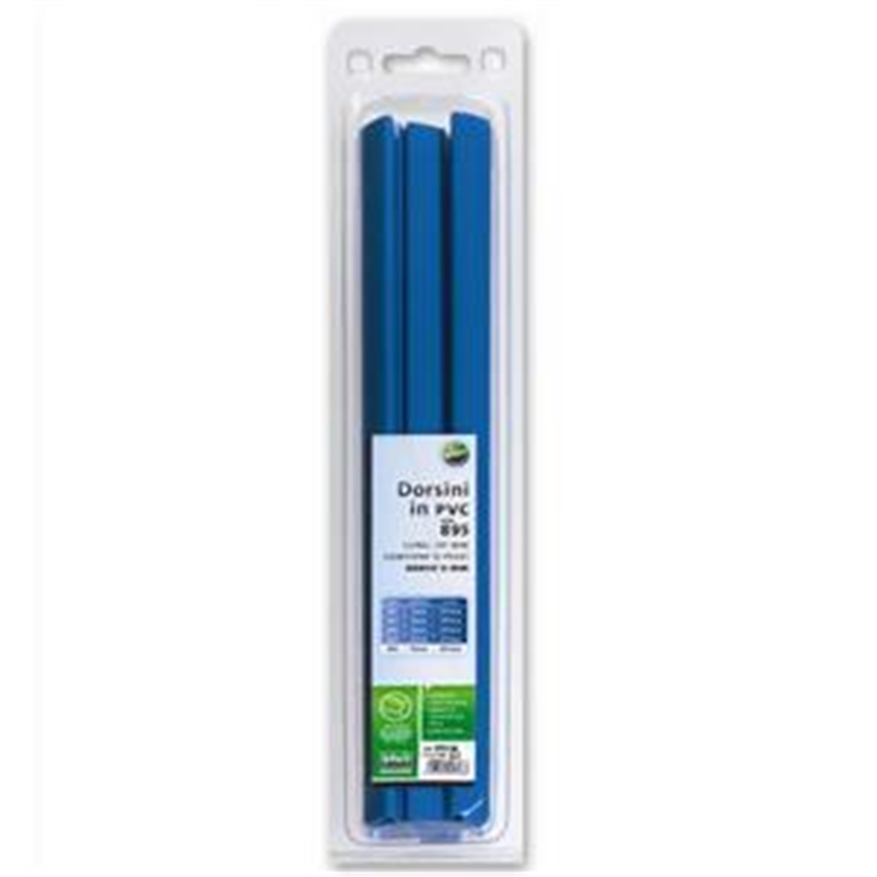 The English translation is: "The Dorso Mm10 Pvc Pz10 Blu by Lebez is a set of 10 blue PVC spines with a thickness of 10 mm, used for binding documents."