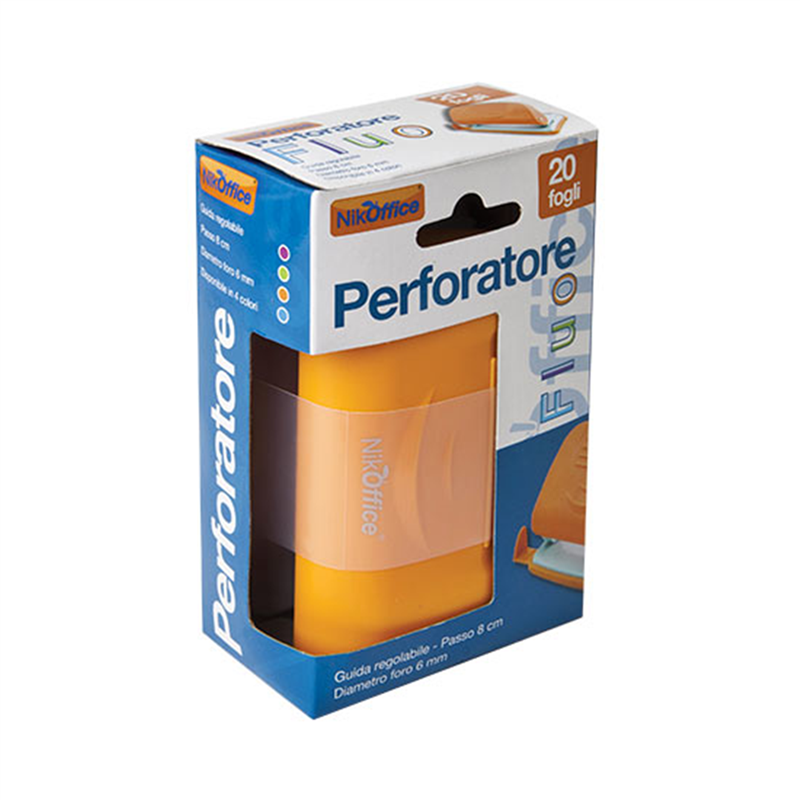 2-hole punch in metal and abs with adjustable guide. Assorted fluorescent colors: green, fuchsia, light blue, orange.