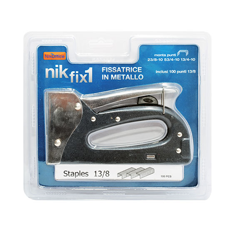 Metal stapler, powerful and ergonomic with 3 categories of mountable staples. Recoil reduction system, suitable for fastening canvas, leather, cardboard and fabrics. Mounts staples no. 23/8-10 – 53/4-10 – 13/4-10. Included in the package are 100 13/8 staples.