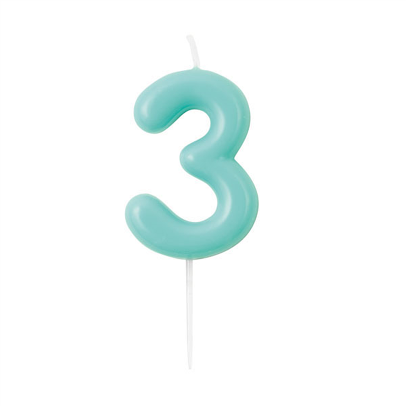NUMBER "-3"- SHAPED CANDLE WITH A GLOSSY FINISH, HEIGHT 10.5 CM, AQUAMARINE COLOR, IDEAL FOR DECORATING BIRTHDAY CAKES. PRODUCED BY GIVI ITALIA SRL.