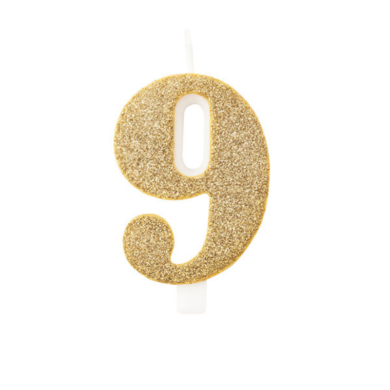 THE BIO GLITTER NUMBER CAKE CANDLE 9.5CM GOLD 9 BY GIVI ITALIA SRL IS A DECORATIVE CANDLE IN THE SHAPE OF A NUMBER 9, MADE WITH BIODEGRADABLE MATERIALS. IT FEATURES AN ELEGANT GOLD-COLOURED GLITTER COATING, IDEAL FOR GIVING A TOUCH OF BRILLIANCE AND STYLE TO BIRTHDAY CAKES OR OTHER CELEBRATIONS. WITH A HEIGHT OF 9.5 CM, IT IS PERFECT FOR BEING CLEARLY VISIBLE AND ADDING A FESTIVE ELEMENT TO YOUR CAKE.